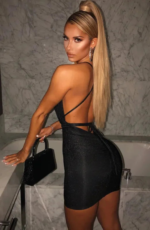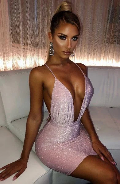 Bring pure danger in this sparkly plunge halter mini. The deep V neckline, glitter finish, and backless crisscross straps make you look like the temptation they weren’t ready for. Perfect for birthdays, club nights, or any moment you want to feel irresistible and unforgettable.